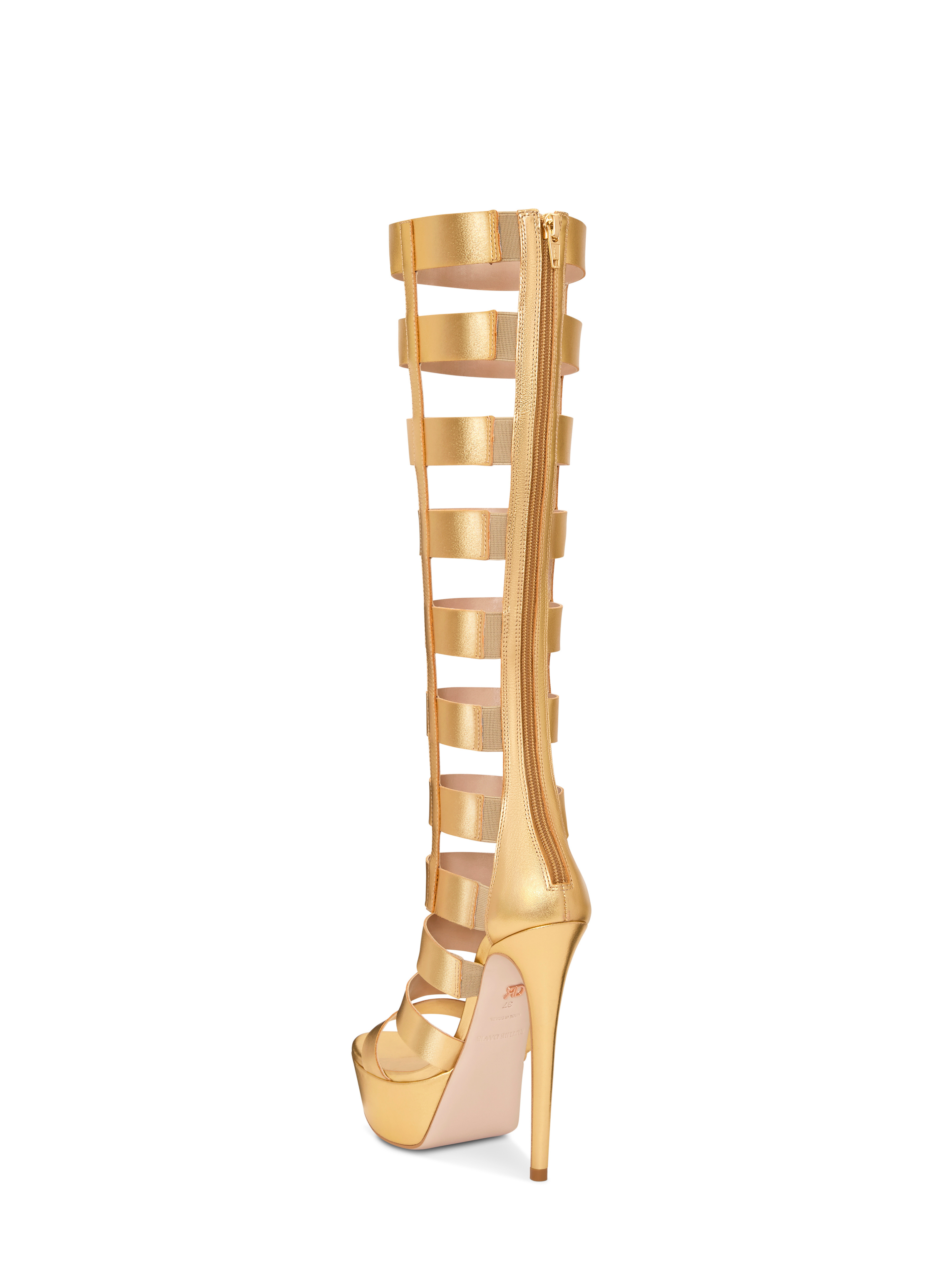COURTNEY in Gold is the showstopper of the season. Designed for Miami weekends away and high shine nights, this below the knee gladiator sandal boot delivers a look that is equal parts sexy and elevated. This avant-garde pattern features hidden stretch gore inserts on every strap except the front to create a custom wrap fit that hugs your leg curves in all the right places. Available in luxe gold metallic leather or bold black leather, COURTNEY is made for the traveler who always packs a power move.